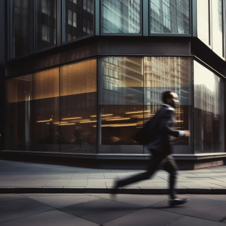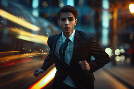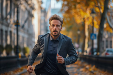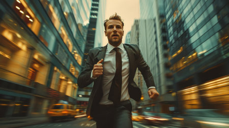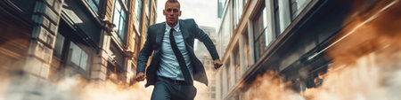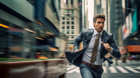 A focused businessman dressed in a stylish suit runs energetically through an urban setting, capturing the essence of ambition and speed. This image represents the fast-paced nature of modern life and career advancement.