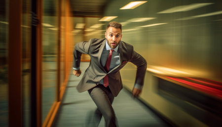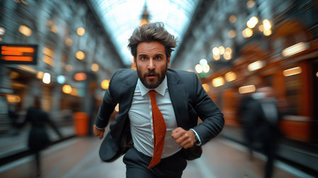 A businessman in a suit is captured mid-run at a train station, showcasing urgency and determination as he hurries with a briefcase, emphasizing urban commuting life.