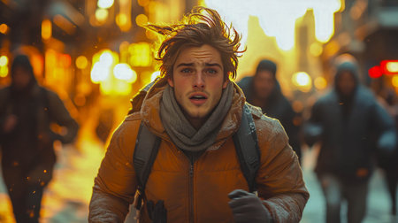 Young man runs swiftly through an urban environment in the late afternoon