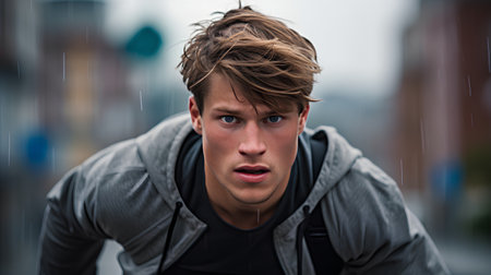 Portrait of a handsome young man wearing sportswear in the rain