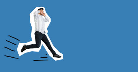 Portrait of young man on blue background in magazine style, collage.
