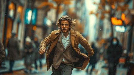 Businessman in suit with beard running through busy city street on a sunny day with blurred motion background