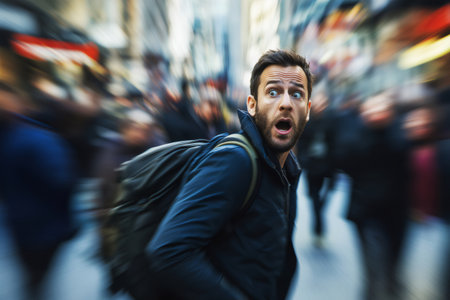 Stressed man in the foreground of a bustling city crowd, symbolizing urban pressure and fast-paced life.