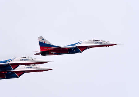 Moscow Russia Zhukovsky Airfield 31 August 2019: aerobatic team swifts MiG-29 perfoming demonstration flight of the international aerospace salon MAKS-2019.