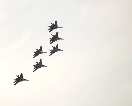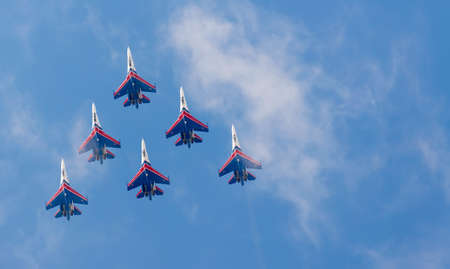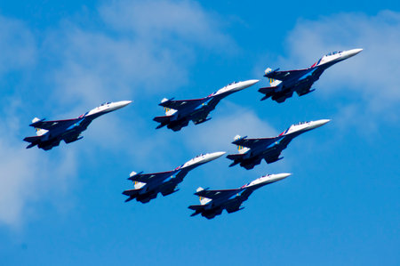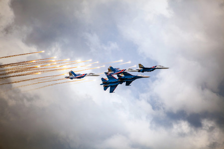 Zhukovsky city, Moscow region, Russian Federation - August 30, 2015. Maks 2015 - International Aviation and Space Salon. Fighter jets in the blue sky in the airshow