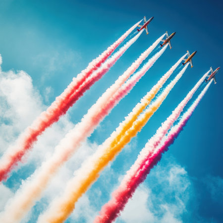 High flying airplanes perform remarkable stunts while releasing colorful smoke trails in a bright blue sky at an air show event.