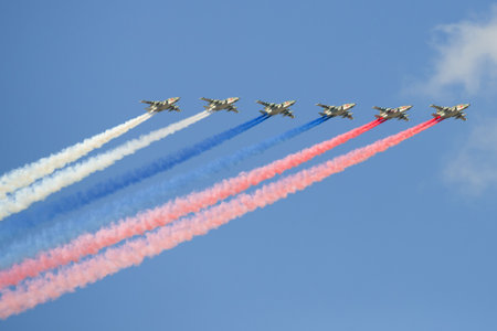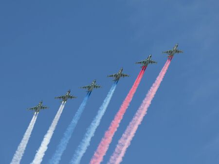 Moscow - May 7th, 2015: six powerful aircraft Su-25 produced a beautiful smoke three colors of the Russian flag at Victory Parade against the blue sky May 7, 2015, Moscow, Russia