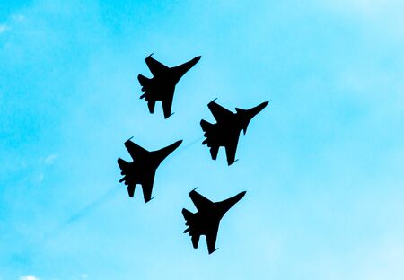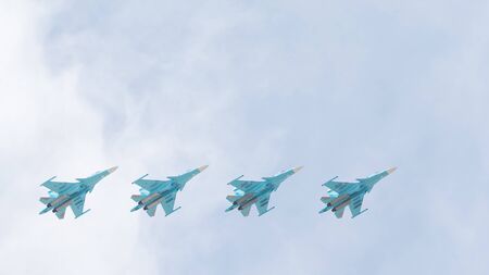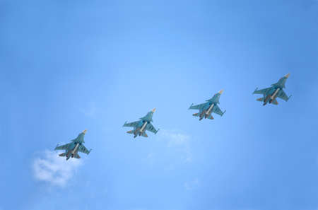 Four aircraft combat fighters SU-34 military fighters flying in the sky a great strong powerful