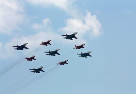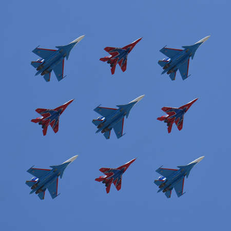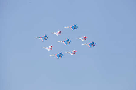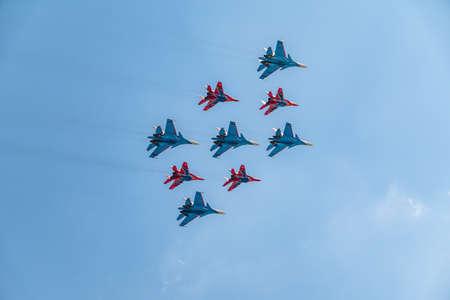 MOSCOW - MAY 9: Aerobatic demonstration team Swifts on Mig-29 and Russian Knights on Su-27 on parade devoted to 70th anniversary of victory in the Great Patriotic war on May 9, 2015 in Moscow.