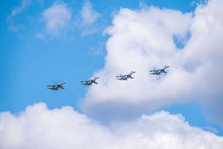 28.04.2020 Russia Rostov-on-don A group of professional pilots of military aircraft shows tricks in the sky. Rehearsal of victory day parade in Russia. In sunny spring summer, clouds float on the blue sky. good cloud weather.