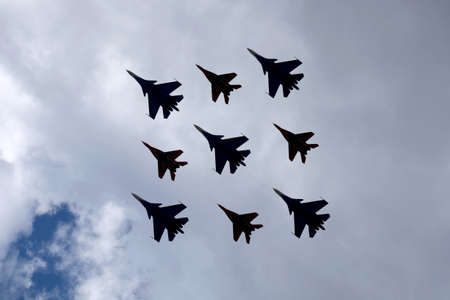 MOSCOW, RUSSIA - MAY 7, 2021: Airplane silhouettes of aerobatic groups Russian Knights and Swifts on MIG-29 and SU-27 fighters flights on parade rehearsal in the cloudy sky