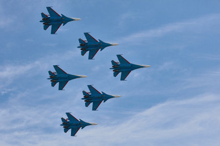 SAINT PETERSBURG, RUSSIA - April, 25, 2015: Flying display and aerobatic show of Russian Knights (Russkie Vityazi) Su-27