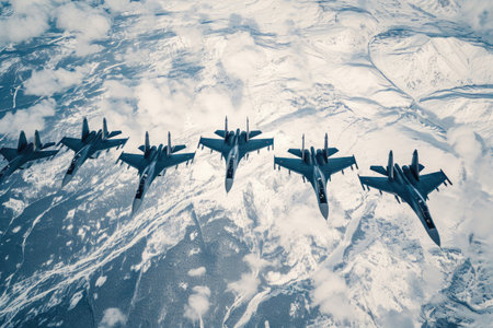 A formation of fighter jets maneuvering through the sky with precision and speed, Aerial view of fighter jets in formation over a snow-covered landscape, AI Generated