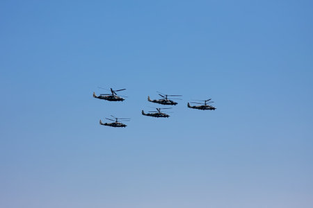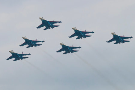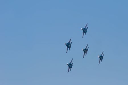 Moscow, Russia - May, 05, 2021: Diamond-shape of 4 Mig-29 The Russian Knights and 5 Su-27 Swifts in the sky over Red Square in the group Cuban Diamond. Aviation part of Victory parade in Moscow