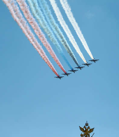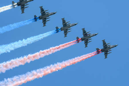 stormtroopers planes Su-25 fly in sky leaving trail of smoke as tricolor Russian flag on training parade in honor of Great Patriotic War victory.