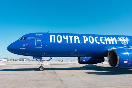KHABAROVSK, RUSSIA - SEP 29, 2018: Tupolev Tu-204 RA-64051 Aviastar Airlines stands in Khabarovsk airport. The Plane Is Russian Post.
