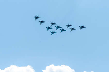Moscow-May 9, 2015: Eight powerful multipurpose heavy fighter gray-blue Su-30 is flying high in the sky at the Victory Day parade May 9, 2015, Moscow, Russia