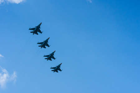 Moscow - May 9, 2015: Four military aircraft MiG-31 flying formation at the Parade of Victory over Nazi Germany May 9, 2015, Moscow Russia