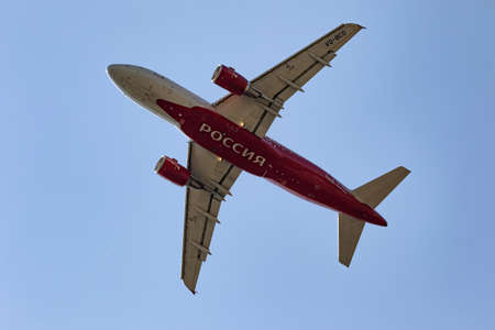 MINERALNYE VODY - SEPTEMBER 05: An Airbus A319-111 of RUSSIA airlines with the tail number VQ-BCO flies over the observer. View from the ground on the plane. September 05, 2020 in Mineralnye Vody, Russia.