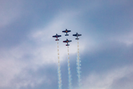 Leszno, Poland - June 16 2023: Antidotum Airshow Leszno 2023 and acrobatic shows full of smoke of The Fyling Bulls Acrobatic Team on a cloudy sky