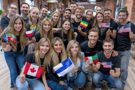 A large group gathers in a bright office, holding national flags and smiling, showing cultural diversity.