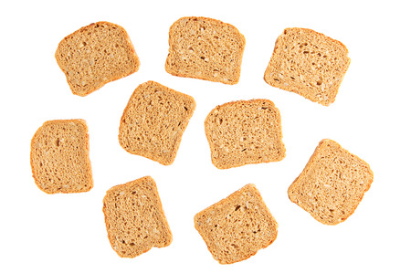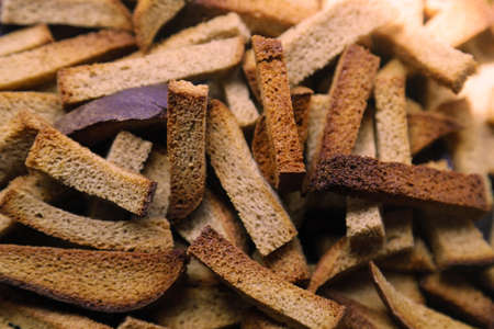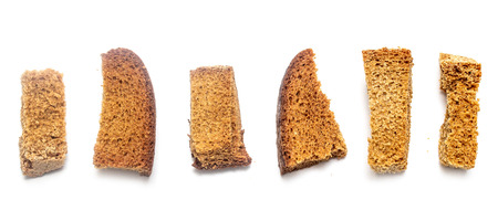 The texture of toasted pieces of bread. Croutons on a white background. Dark dry bread.