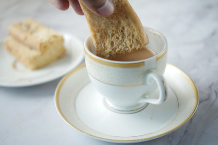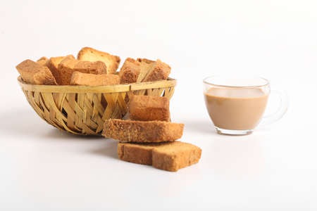 Square toasted pieces of homemade delicious rusk, hardtack, Dryasdust, zwieback on a plate and black tee in a cap on a white tablecloth