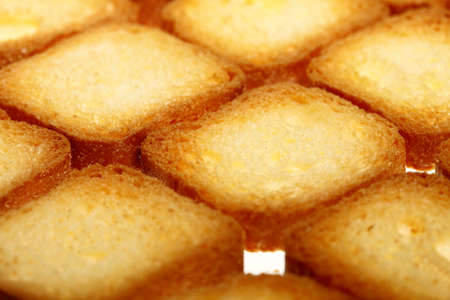 Selective focus on slices of fried white bread close-up. Tasty rosy croutons. Abstract food background.