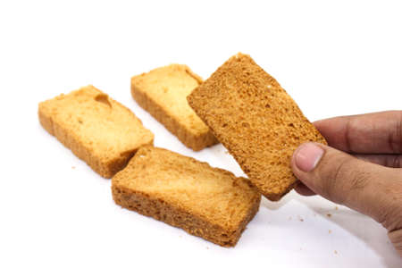 Square toasted pieces of homemade delicious rusk, hardtack, Dryasdust, zwieback stand in columns on a white tablecloth