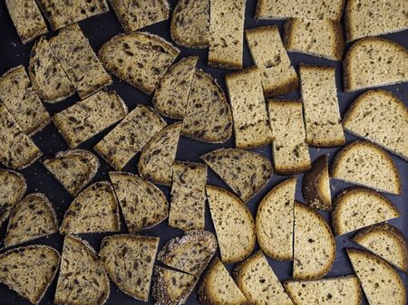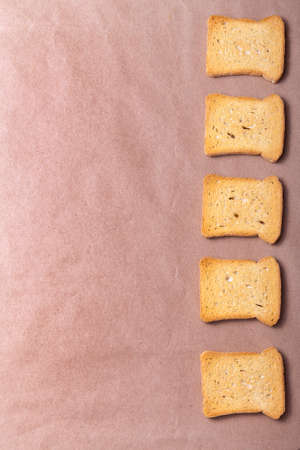 Many small dried rusks bread loaf toast biscuits as texture background. Diet food healthy nutrition.