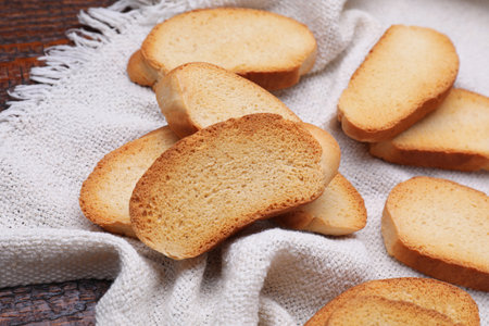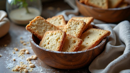 Crispy toasts in rustic wooden bowl on rustic table with linen cloth. That the image is generated using AI.
