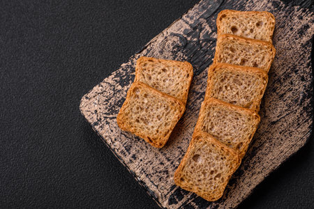 Delicious salted rectangular wheat croutons with salt and spices on a dark concrete background
