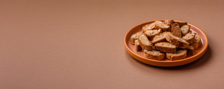 Homemade hot crunchy croutons in rustic style with copy space. Round spicy bruschetta crackers, seasoning rusks or small fried bread snacks on wooden plate