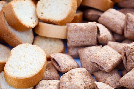 Many closeup bread chucks crackers, breakfast concept, kitchen background, healthy eating concept