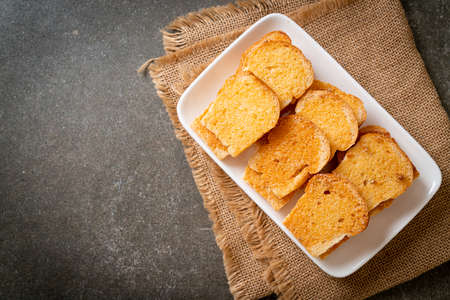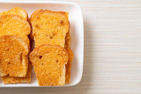 The theme of the Breakfast. Crispy crispy toast on the plate. Macro