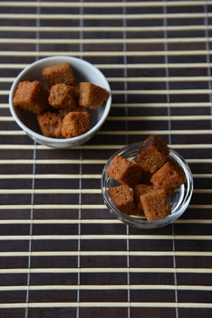 Fresh croutons for hot autumn cream soups. Traditional fast crisp snack. In ceramic bowl on a stone background, copy space