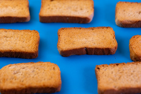 Crispy golden rusks arranged on a vibrant blue backdrop. Perfect for breakfast, snacking, or food photography projects.