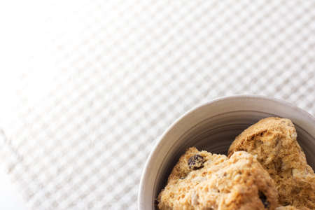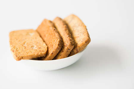 Golden baked health rusks in a ceramic bowl on a checkered napkin on a white table cloth. Image contains copy space.
