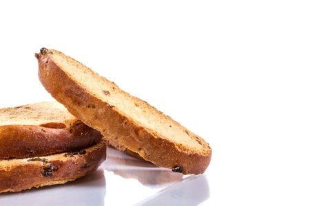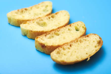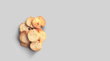 A closeup view of dry bread slices under the lights isolated on a grey background.