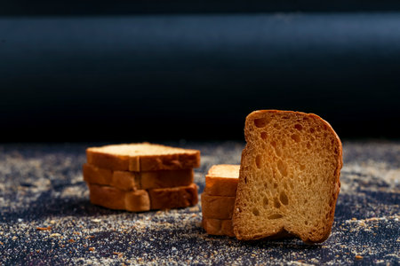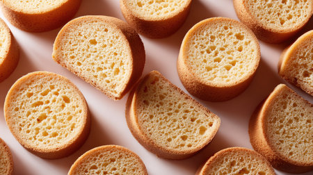 Toasted slices of bread are perfectly arranged on a dark background, creating a visually appealing arrangement