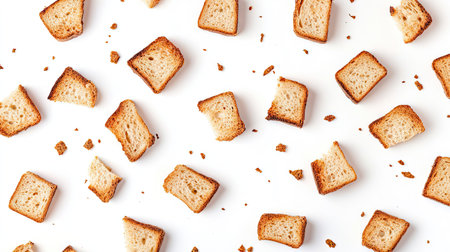 Pieces of evenly browned toast bread scattered on a white background, perfect for a minimalistic food concept