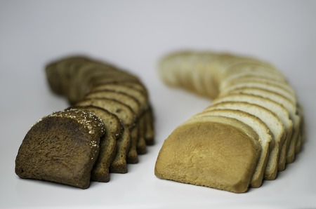 Slices of fresh bread pattern on a white background. Minimal creative food concept. Top view. Flat lay.