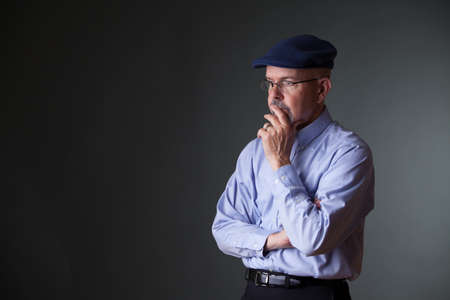 gentleman in shirt and hat looking away and thinking