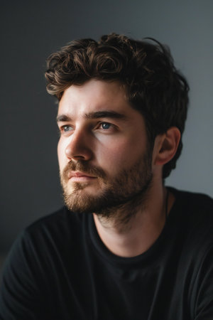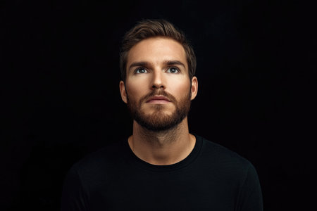 Thoughtful man with beard looking up against dark background.