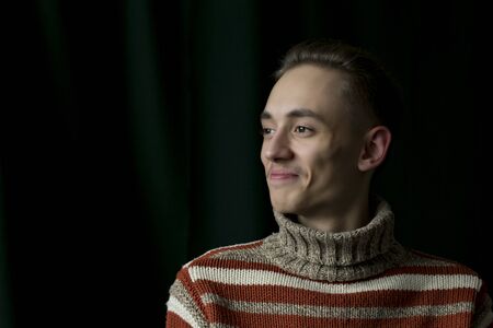 Portrait of a young man wearing a black T-shirt. A man in a black classic sweater on a black background. The dark-haired young man. An enigmatic look.
