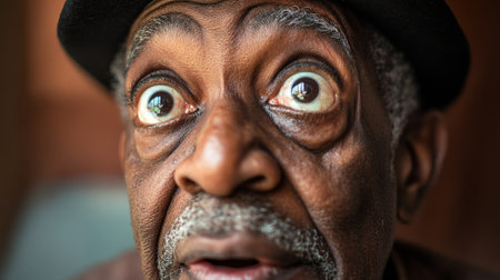 A Black granddad, surprised and wide eyed, his big, beautiful eyes reflecting a moment of wonder, captured in a close up portrait that emphasizes his joyful expression.