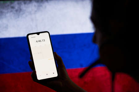 Smartphone and Visa Bank Card Piece against a gray background. There is a map of Russia on the smartphone display. A cut-off piece of blue credit card. Selective focus. Kiev, Ukraine - 01 05 2022.