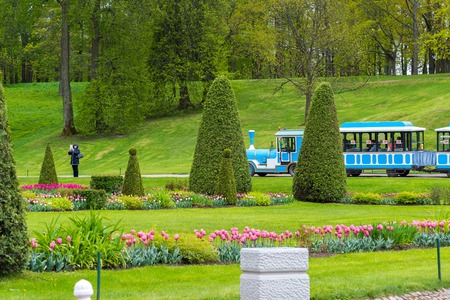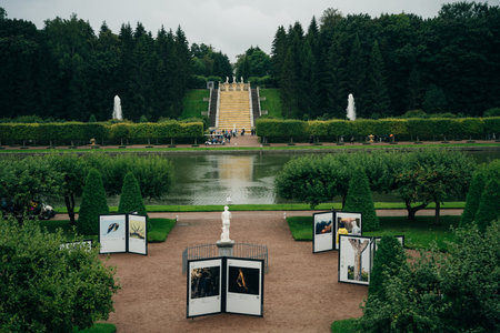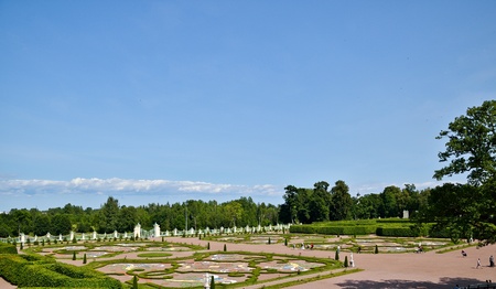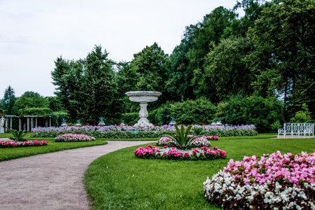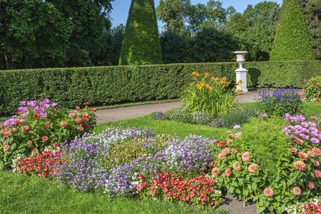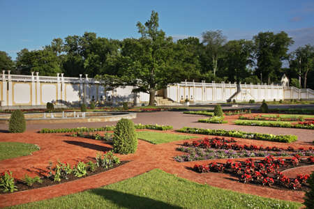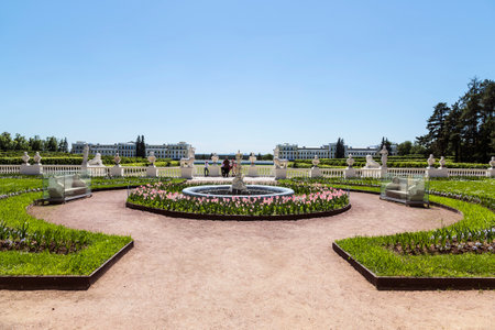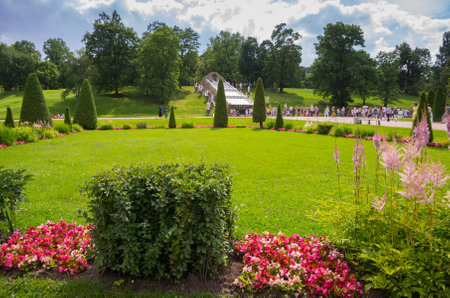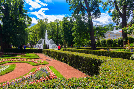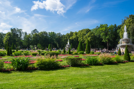 St. Petersburg, Russia - June 25, 2019: Garden near Monplaisir Palace in lower park of Peterhof in Saint Petersburg, Russia