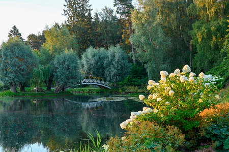 Sofia Park, Uman. Beautiful yellow flowers by the river in the park. Green park with lake and white statues. River in the park, orange flowers and a statue