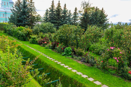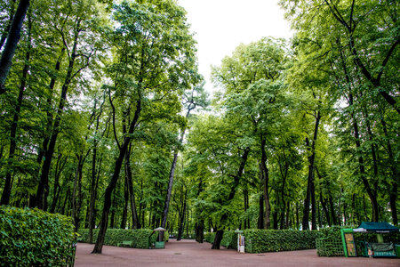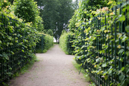 Green city park with walking paths, trail next to a green hedge, cloudy day, Summer garden, Saint Petersburg, Russia